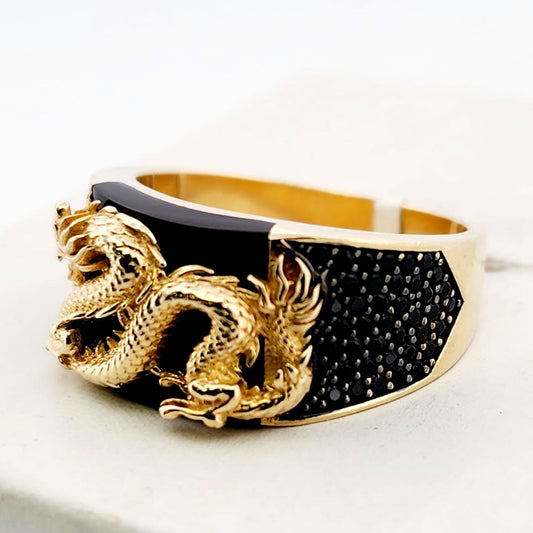 MEN'S FASHION 14K DRAGON RING WITH/ ONIX